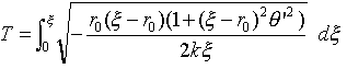 です。ただしGM=kとしました。式(9)でξがr0に比べてじゅうぶん小さい場合、分母のξを無視すると、v=(2GMξ/r02)1/2であり、さらにr0が地球の半径と大体等しければ(地表面付近であれば)、GM/r02=gなので、ふつうの最速降下線問題になります。つまり式(9)分母のξは、逆二乗力という条件下では落とせないわけです。式(8),(9)を用いれば、式(4)は、