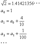 ここまででけっこう長くなってしまいましたが、この同値類さえ片付ければ、実数の構成はほぼ完成です。 あとは「完備化!」と叫ぶだけで事は終わります。前節までで、コーシー列と収束列は本質的に同じで、 コーシー列でもって任意の実数を定義できそうなことがわかりましたが、まだ問題があります。 それは、ある実数を定義するコーシー列は唯一つではない、という事実です。 例えばの小数展開(10)において現れたコーシー列(an)の部分列は、 やはり