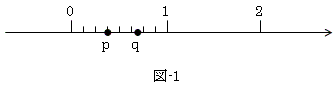 原始的な物差しのイメージは右図のようなものだと思います。 等間隔に単位距離0,1,2,・・・を並べ、その中間にある点pを表すために、単位距離の間に補助目盛を設けます。 ここで補助目盛のとり方は任意ですが、等分割が原則です。図-1では点pは、3/8となります。 補助目盛の中間にくる点qのような場合も同じです。 補助目盛のとり方は任意なので、もっと細かい補助目盛間隔を使います。例えば1/16とか。 ここで、採用した補助目盛間隔を1/nで表し(nは0でない自然数)、1/nを分割単位,その分母nを分割と呼んでおきます。