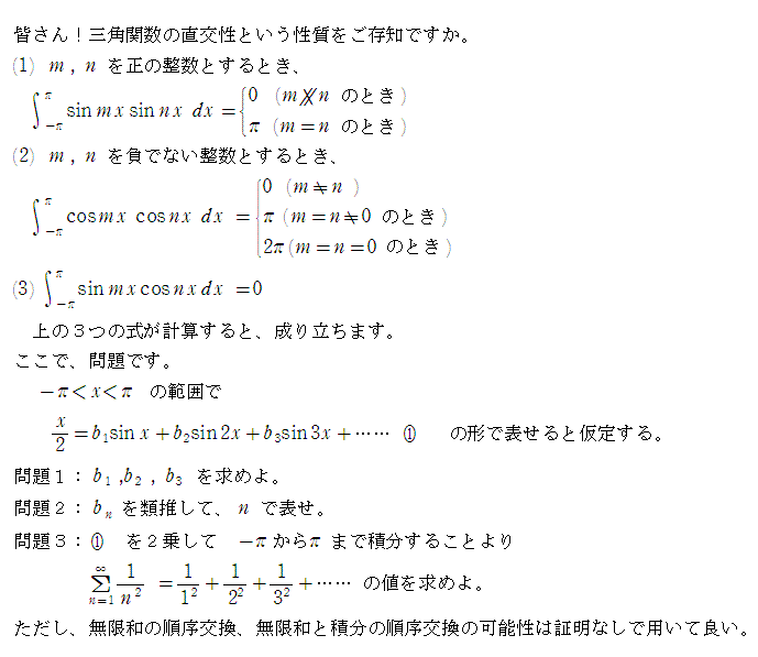 皆さん、ゼーター関数をご存知ですか。今回の問題はフーリエ級数とζ(2)の関係です。