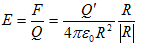 ところで、(1)のFをQ'がQに及ぼす力とみなすとは、電荷Q'を力の発生源とみなすのと同じです。力とは相互作用です。そうするとQ'は作用の発生源だとも言えます。Q'が作用の発生源であるならば、その作用は、Q'の性質だけで規定されるのが望ましいと思えます。しかし(1)の力Fは、作用する先の電荷Qにも影響されます。そこで(1)をQで規格化し、Q'の性質だけで規定される作用を定義します。