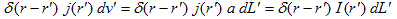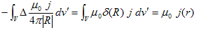 後は電流密度j(r') が、そこら中に連続して分布する場合、Δの線形性から(6)を使って、