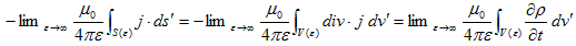 Sを閉曲面とすると電流は、Sで囲まれた体積Vからの電荷の流出速度を表わしているので、これはVに含まれる電荷量の変化速度に等しくなります。