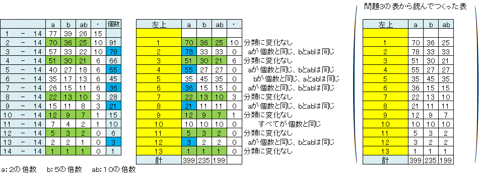 後で使うので、右の表のように各行から最後の14行目までそれぞれいくつあるか数えておきます。