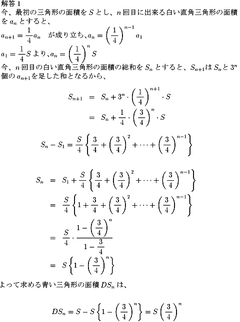 問題の操作を繰り返すとき、辺の長さと青い部分の直角二等辺三角形は それぞれ1/2倍、3倍ずつ増えるので